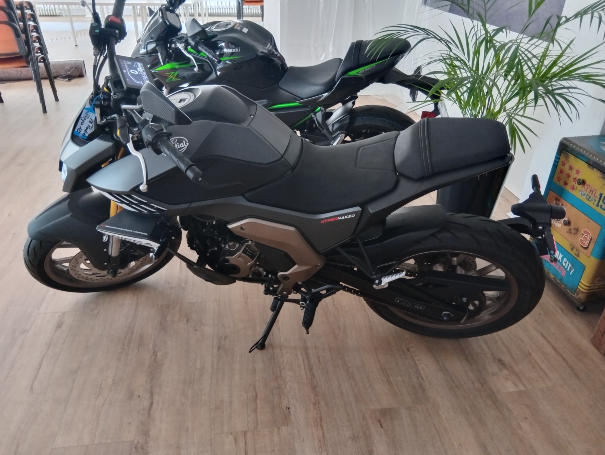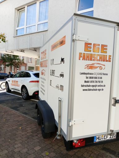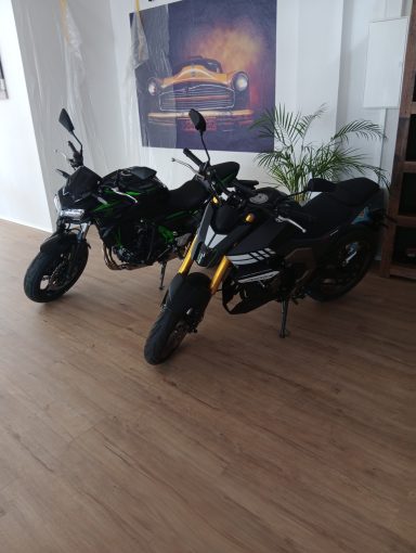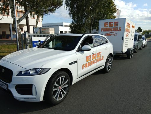 Unsere Ausbildungsfahrzeuge Klasse B/BE Jaguar F-Pace Automatik, Klasse B MG HS Schaltgetriebe, BE Anhänger, Klasse A Kawasaki Z650, Klasse A1 und B196 Mondial Piega 125ccm